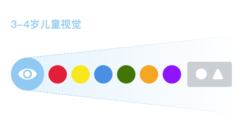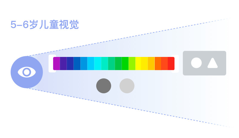 为儿童做设计与为成人做设计的其中一项重要的区别是,成年人的各项能力相对稳定,而儿童则处于变化发展中,尚未成熟的阶段。因此我们需要根据用户所处年龄段的能力特点,来选择适合的设计方案。色彩的选择,我们第一步要了解的就是孩子的视觉发育特点。儿童的视觉从2岁进入旺盛发育期,此时可以判断出实物的大小方位远近等空间概念。