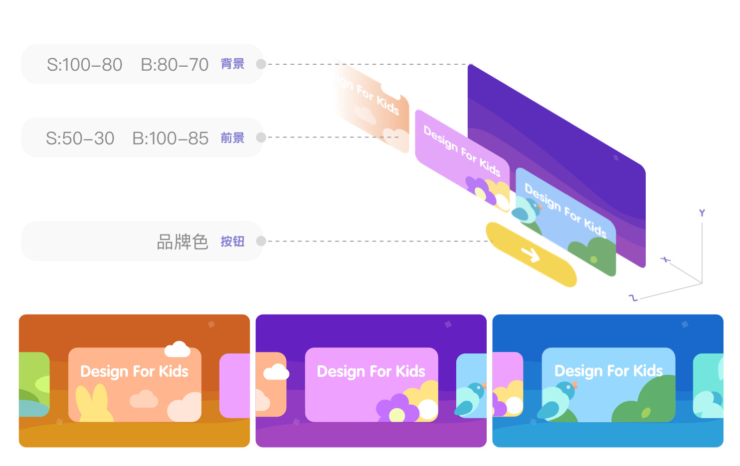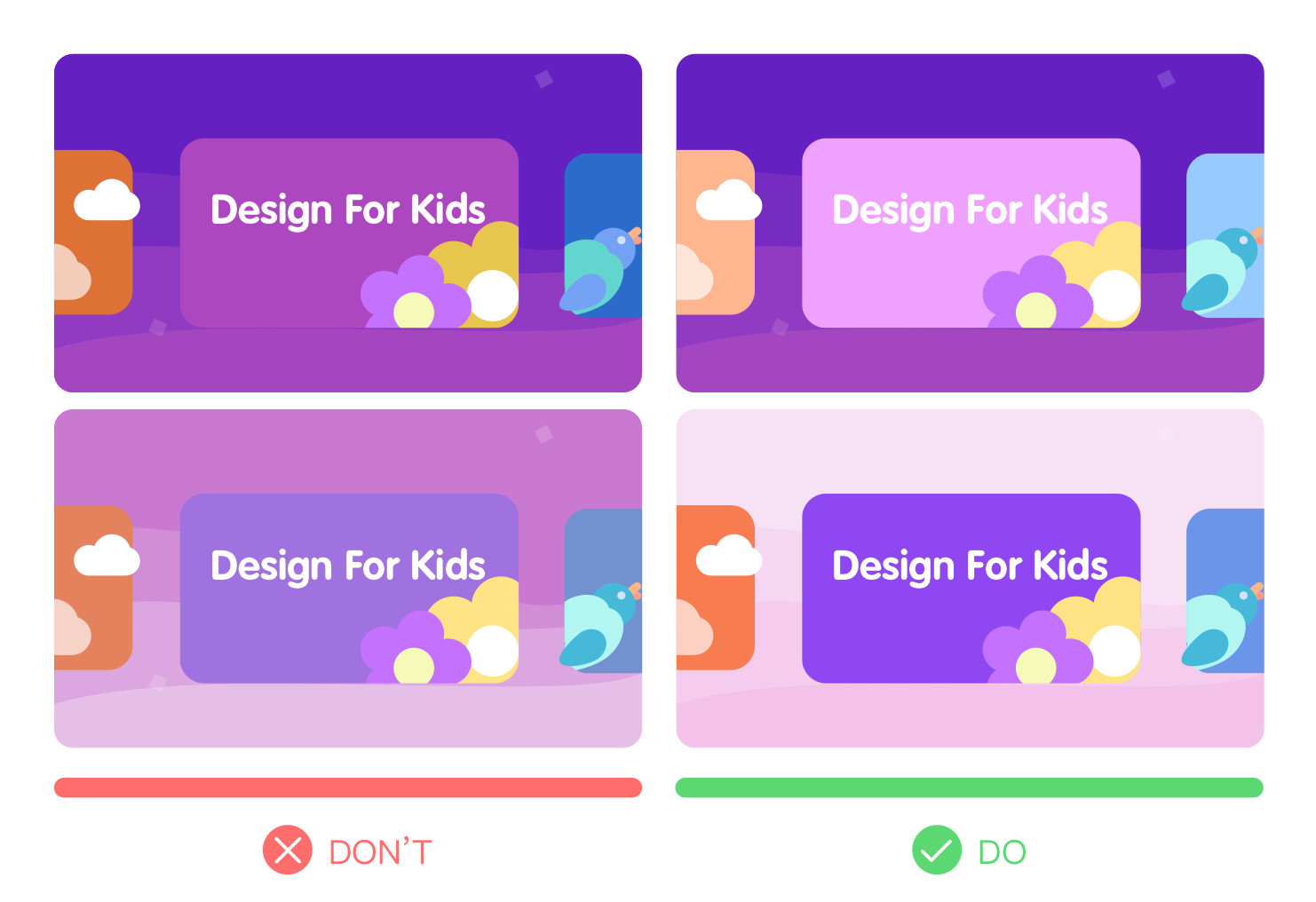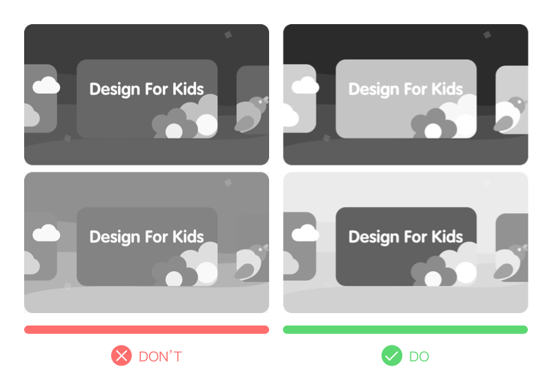 根据儿童的视觉发育特点,饱和度高、鲜艳的颜色是最早也最容易被孩子感知和辨认的颜色,最能吸引其注意力,但我们需要克制使用,并建立起清晰的色彩层级,原因有2个:一是因为大面积饱和度高的颜色,容易引起视觉疲劳,对尚处于发育阶段的视力造成伤害,所以切记不大面积使用。所以选择色彩时,不能一味追求高饱和的刺激性颜色,还需要我们对颜色的明度、饱和度进行柔化调整,以保证让视觉舒适度,保护孩子的视力。这里推荐使用HSB模式来调整,以下图的红色为例,未经调整的红色,饱和度高虽然醒目,但太过刺眼生硬,视觉体验不佳。我们可以对红色的S(饱和度)和B(明度)进行调整,调整过后的红色更加柔和,适于观看。此方法还可以用于多色协调的管理,达到视觉审美上的统一。当页面出现多色时,若颜色的饱和度、明度不一,也容易造成视觉效果上的不和谐。如下图所示,能明显感觉到其中红色比较突兀。而要使这组颜色变得和谐统一,只需要调整S、B值就可以,调整前后对比效果明显。二是因为儿童还缺乏成年人所具备的视觉筛选能力,难以区分重要、次要元素。所以在设计的时候,我们需要建立清晰的色彩层级,为前景、背景、及可交互操作设置强烈的视觉区分。若前景选择低明度,对应背景择选择高明度;若前景选择高明度,对应背景则选择低明度,以突出主流程,降低视觉信息的复杂性在去彩模式下看,可以更明显的感受到颜色明度的差别。9岁以下孩子还不具备理解二维平面中我们利用投影、透视等塑造的三维空间关系,因此信息层级的区分,主要依靠颜色和形状来完成,而加大前、背景颜色明度的对比则是帮助孩子区分重要、次要元素的重要手段。利用色彩的S、B值来建立明确等级,S、B值可以是一个固定数值,也可以预设一个数值区间,这样既能保证色彩的和谐统一,也能在具体的场景使用中保有有灵活调整的空间。关于层级的建立,除了色彩的应用还可以借助声音和动效,加强对比。