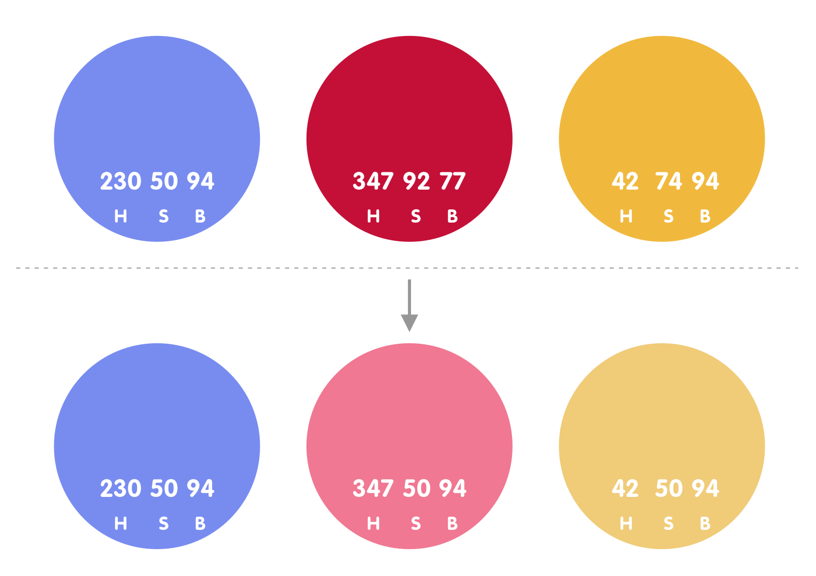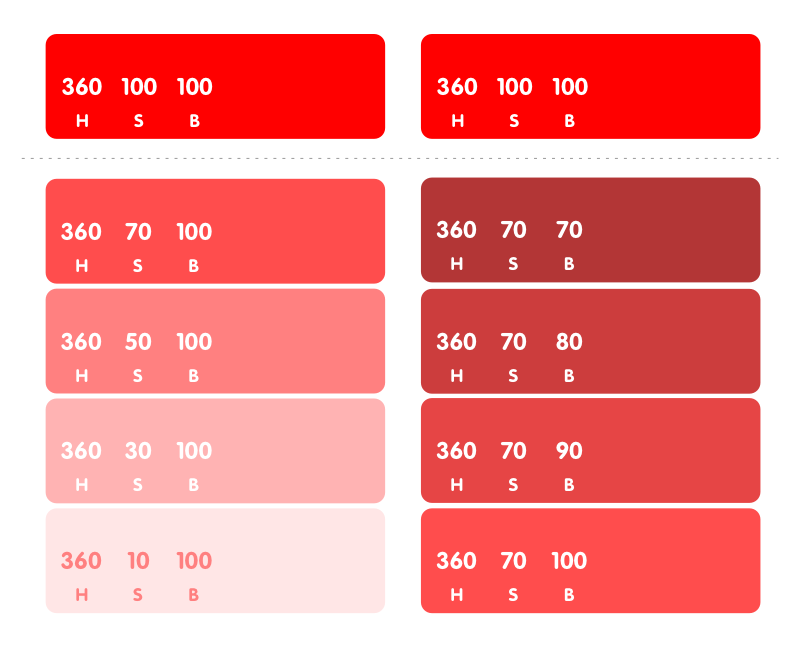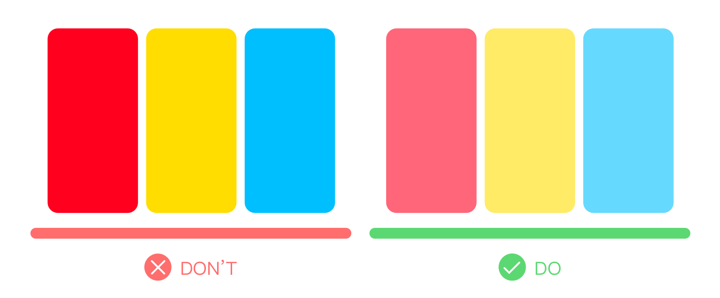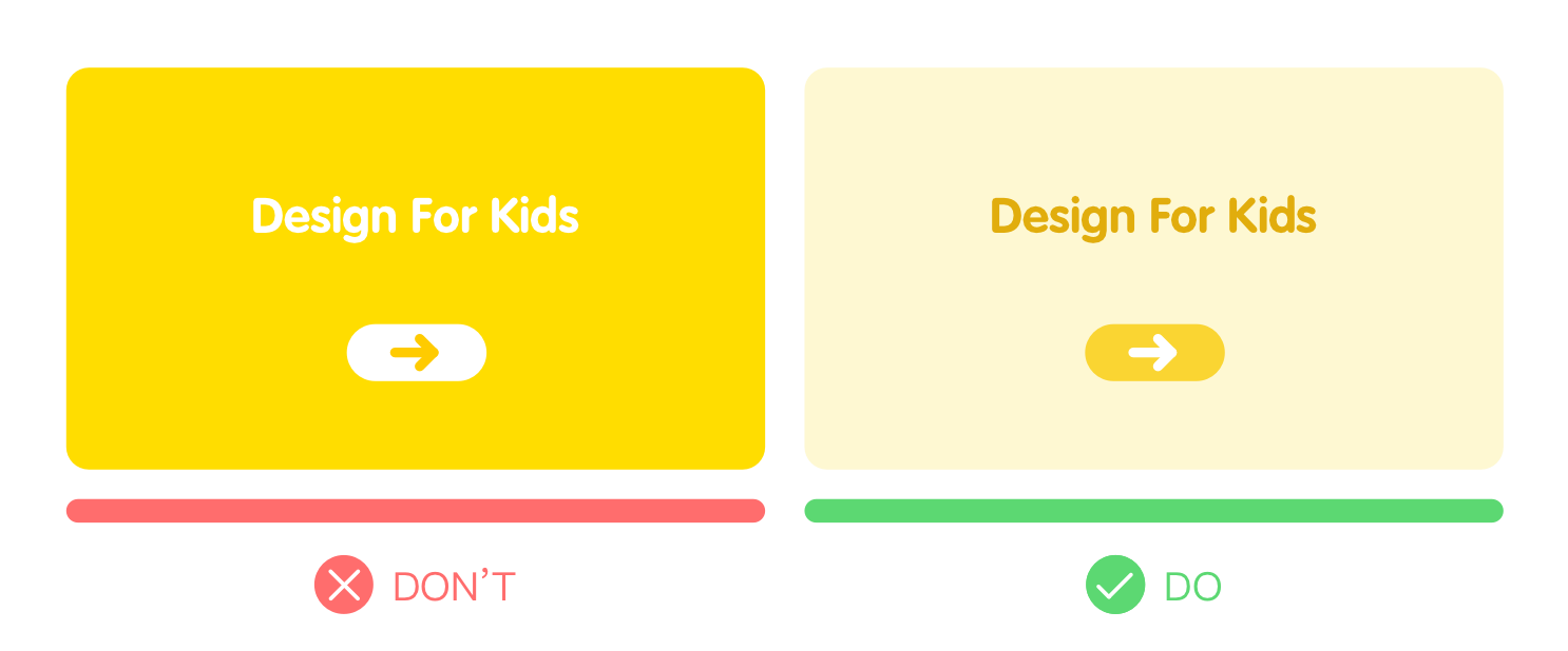 根据儿童的视觉发育特点,饱和度高、鲜艳的颜色是最早也最容易被孩子感知和辨认的颜色,最能吸引其注意力,但我们需要克制使用,并建立起清晰的色彩层级,原因有2个:一是因为大面积饱和度高的颜色,容易引起视觉疲劳,对尚处于发育阶段的视力造成伤害,所以切记不大面积使用。所以选择色彩时,不能一味追求高饱和的刺激性颜色,还需要我们对颜色的明度、饱和度进行柔化调整,以保证让视觉舒适度,保护孩子的视力。这里推荐使用HSB模式来调整,以下图的红色为例,未经调整的红色,饱和度高虽然醒目,但太过刺眼生硬,视觉体验不佳。我们可以对红色的S(饱和度)和B(明度)进行调整,调整过后的红色更加柔和,适于观看。此方法还可以用于多色协调的管理,达到视觉审美上的统一。当页面出现多色时,若颜色的饱和度、明度不一,也容易造成视觉效果上的不和谐。如下图所示,能明显感觉到其中红色比较突兀。而要使这组颜色变得和谐统一,只需要调整S、B值就可以,调整前后对比效果明显。二是因为儿童还缺乏成年人所具备的视觉筛选能力,难以区分重要、次要元素。所以在设计的时候,我们需要建立清晰的色彩层级,为前景、背景、及可交互操作设置强烈的视觉区分。若前景选择低明度,对应背景择选择高明度;若前景选择高明度,对应背景则选择低明度,以突出主流程,降低视觉信息的复杂性在去彩模式下看,可以更明显的感受到颜色明度的差别。9岁以下孩子还不具备理解二维平面中我们利用投影、透视等塑造的三维空间关系,因此信息层级的区分,主要依靠颜色和形状来完成,而加大前、背景颜色明度的对比则是帮助孩子区分重要、次要元素的重要手段。利用色彩的S、B值来建立明确等级,S、B值可以是一个固定数值,也可以预设一个数值区间,这样既能保证色彩的和谐统一,也能在具体的场景使用中保有有灵活调整的空间。关于层级的建立,除了色彩的应用还可以借助声音和动效,加强对比。