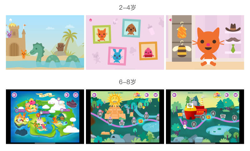 由于各年龄段儿童视觉与信息处理能力上的差异,设计师也需要根据用户所处年龄段,选择相应的色彩丰富度,既要满足孩子的信息摄取需求,维持页面对孩子的吸引力;也要避免信息过载给孩子们增加产品使用难度。如下图,分别是针对2-4、6-8岁用户的产品,我们可以看出二者的区别。2-4的产品,界面突出主体,没有过多细节,背景、环境的装饰较少,色彩以柔和简洁的单色为主,几乎没有渐变色的使用。6-8的产品,装饰细节明显增加,有了环境的塑造,色彩更加丰富且加入了渐变色的使用。总体规律是年龄越小的用户,产品色彩应越简单,细节越少;用户年龄增长,色彩丰富度及细节也随之增加,有更多信息呈现。关于更多年龄段色彩风格特点,以及该如何处理全年龄段用户产品的年龄分层与视觉风格统一等问题,受篇幅影响,会单列出来再后续文章中展开。为儿童做设计很重要的一点是,我们的用户是孩子,他们的心智、能力都与成年人有明显差别,且处于发展中的动态阶段。我们或多或少会带有年成人对于孩子喜好的臆想和偏见,用自己的成人审美替孩子做选择,而忽略了孩子的需求,这也是孩子们觉得有些产品不好用的原因。我们需要更多地尊重和了解,更加主动的耐心观察,了解用户所处年龄段特征,了解他们的生、心理发展情况,什么能吸引他们的注意,什么让他们觉得无聊,需要为他们提供哪些保护……代入孩子们的视角,才能让产品更贴近和符合孩子的需要。