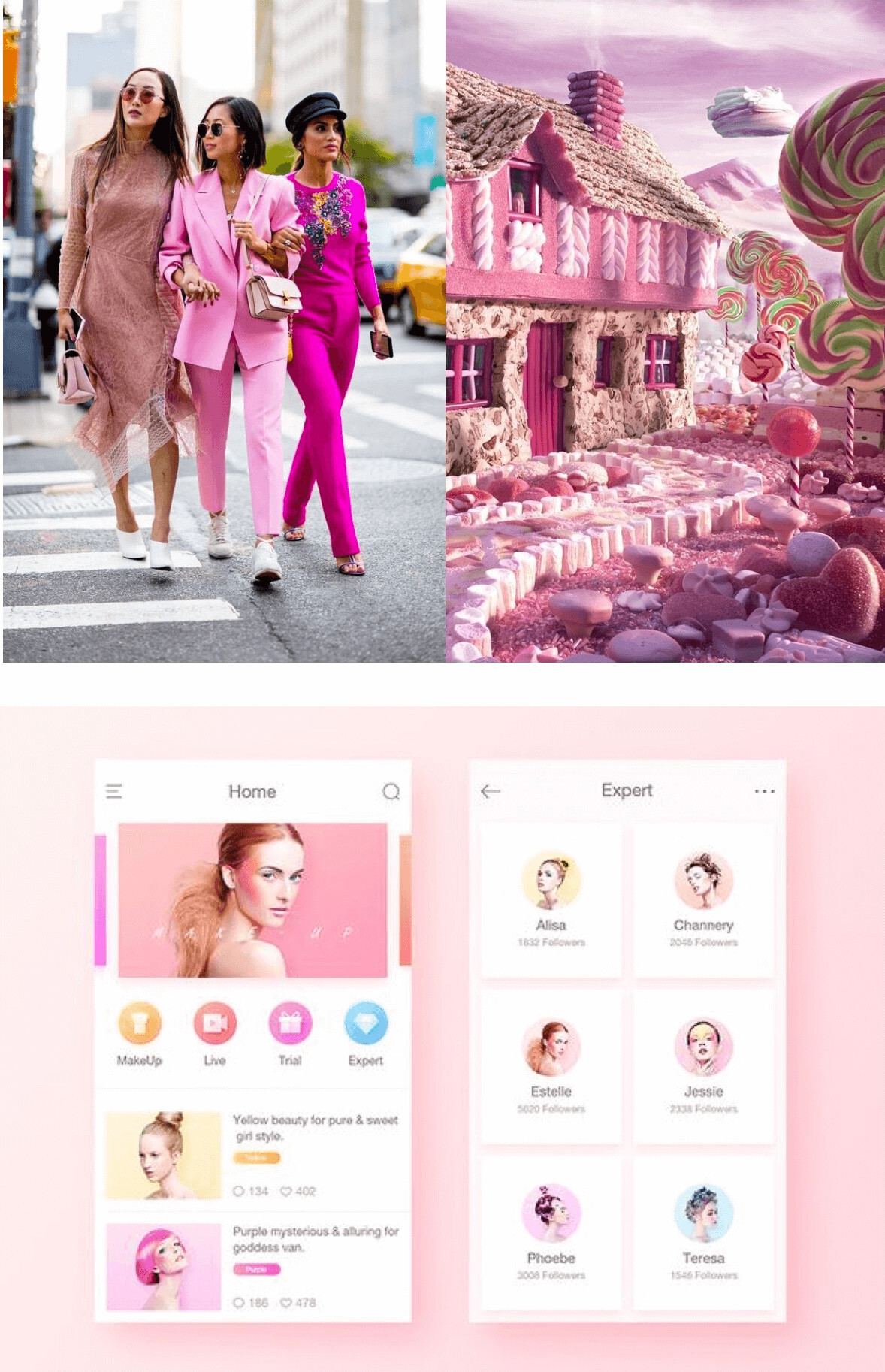 粉色代表女性,代表年轻的活力,粉色比较柔软有爱的感情,同时粉色和年轻女性气质密切相连,因此如果你的用户是女孩,那么粉色是一个很合适的配色。
