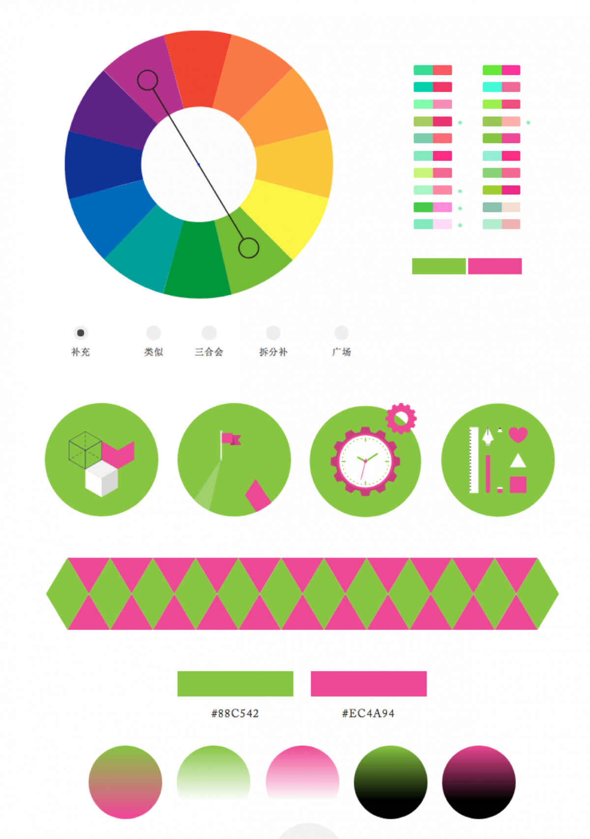 在色相环中每一个颜色对面(180度对角)的颜色,称为互补色,也是对比最强的色组。把对比色放在一起,会给人强烈的排斥感,搭配不好会很山寨。