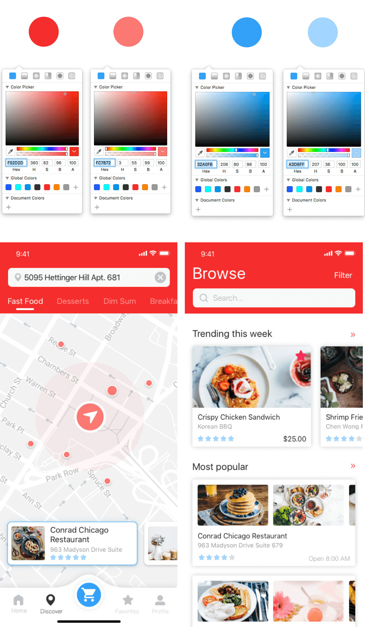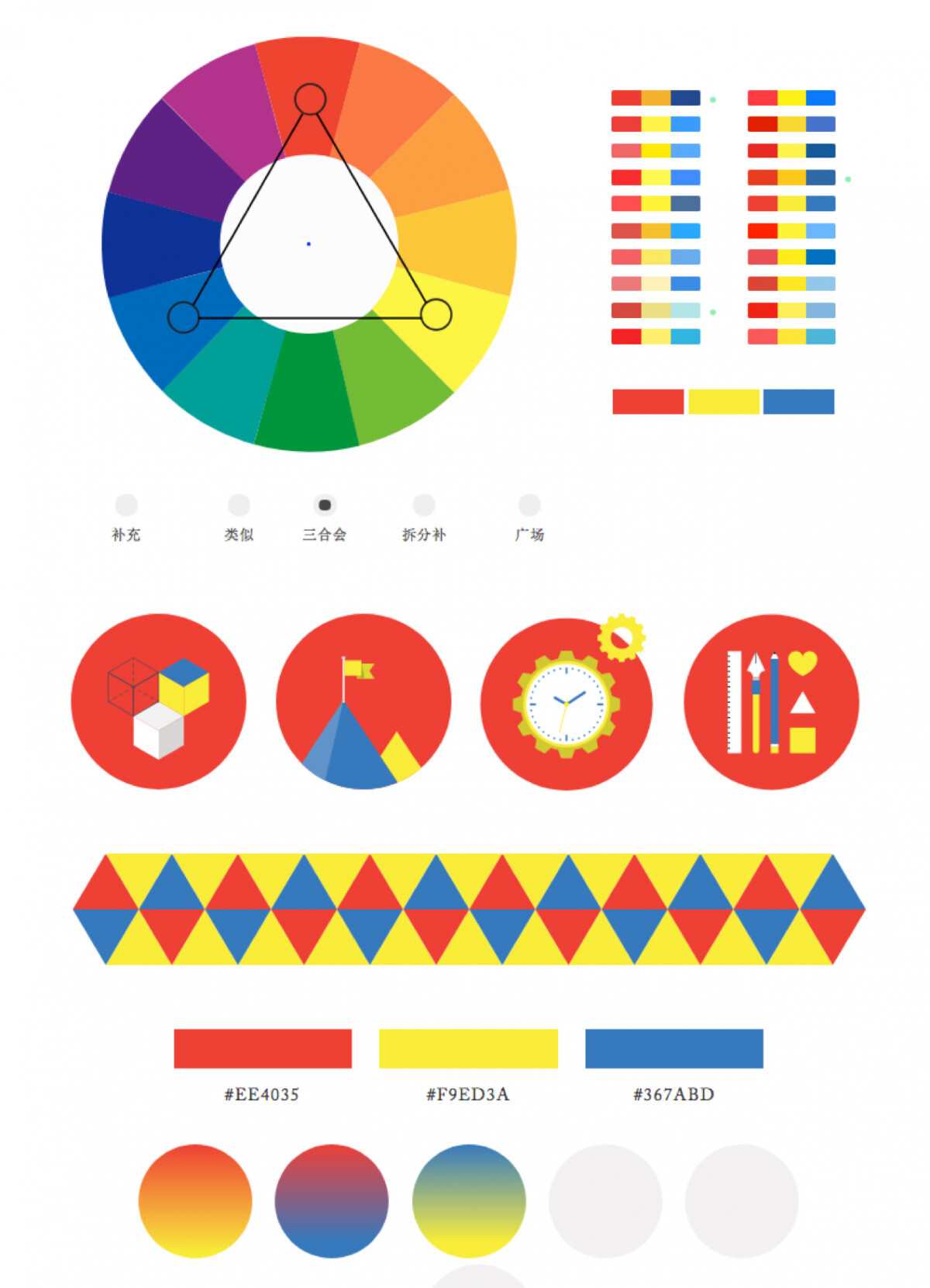 这个原理其实就是互补色基础上进行拆分,对主要颜色增加一个辅助色,比如主要颜色红色,蓝色,那么我们增加一个淡粉色和淡蓝色作为辅助色,它的目的让颜色满足更多场景。