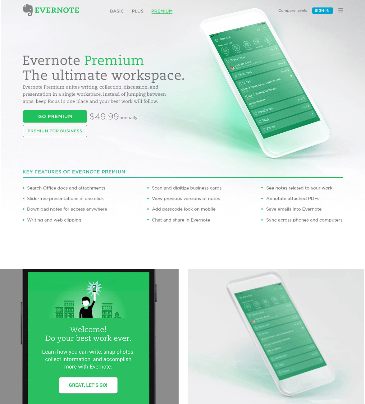 ▲ 印象笔记的设计,从整体的网站设计,到界面,到引导页面,都是讲印象笔记经典的绿色用到彻底,形成品牌色彩认知。