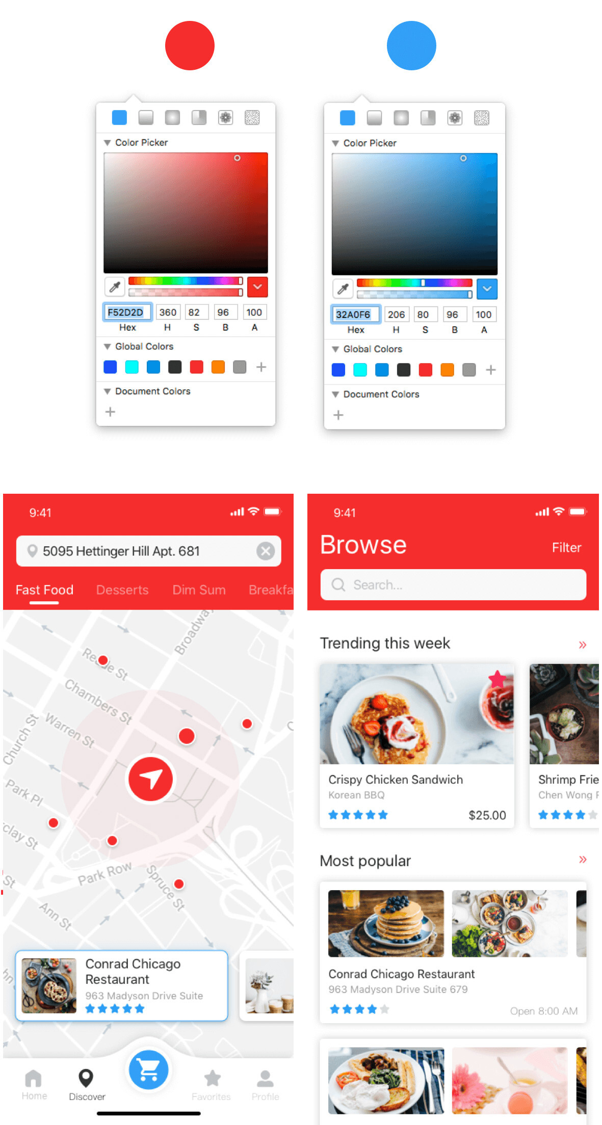 互补色比单色,邻近色更加吸引用户注意力,前面我们说了,互补色在色彩里面是对比最突出的,我们主页面是红色,蓝色补色是我们需要强调吸引用户注意。