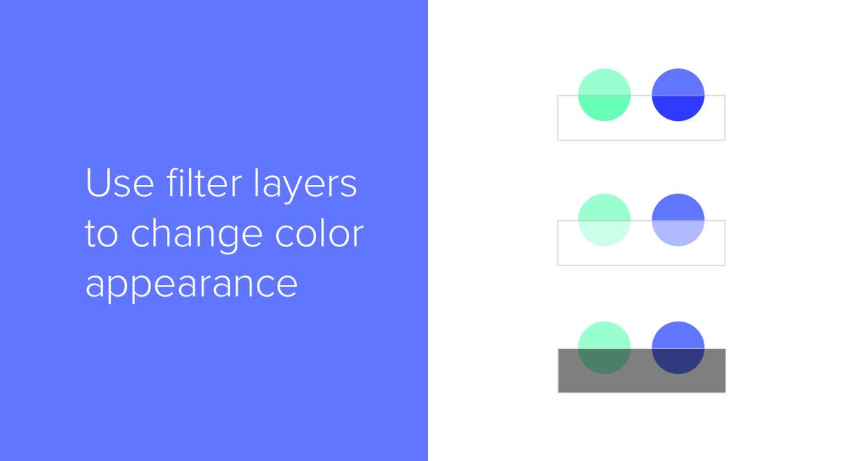 想象有一张半透明的纸,当我们将它置于色彩上方的时候,它能够从视觉上“消减”色度。我们可以在PS和Sketch中来模拟这样的“纸”,新建形状,通过调整透明度和混合模式,或者搭配使用来实现不同的效果,我们还可以调整纸张本身为白色或者黑色,在叠加混合模式下,能对色彩的饱和度产生不同的影响。在有的UI设计项目当中,会借助这样的技术来暂时调整整个区域的敏感色度,这比改色更加轻松,还保持了色彩之间的协调度。