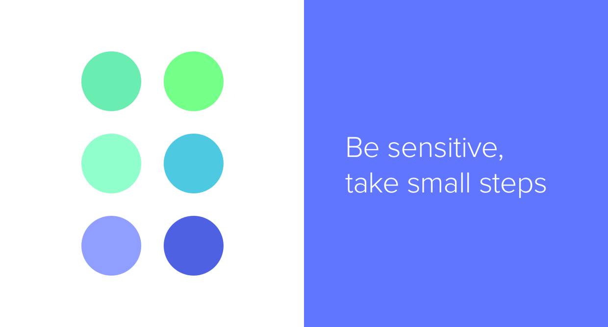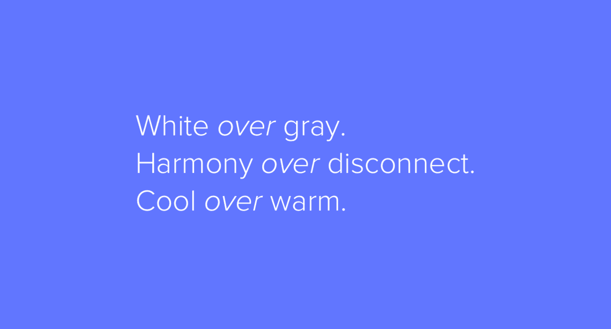 在开始着手挑选配色之前,我常常会翻看 Dustin Senos 关于设计原则的短文。他在文章中,阐述设计原则的方式非常有意思,干练而有趣,“方向优于选择”,“合适优于一致”,“发展性优于总结”。其实如果借用这种句式来总结配色也不错:“白色优于灰色”,“和谐优于错位”,“沉静优于热烈”。当我在工作的时候,我会时刻谨记这些配色策略,它们更像是一种感觉上的规范,就像用户角色引导UX设计师来设计体验一样。