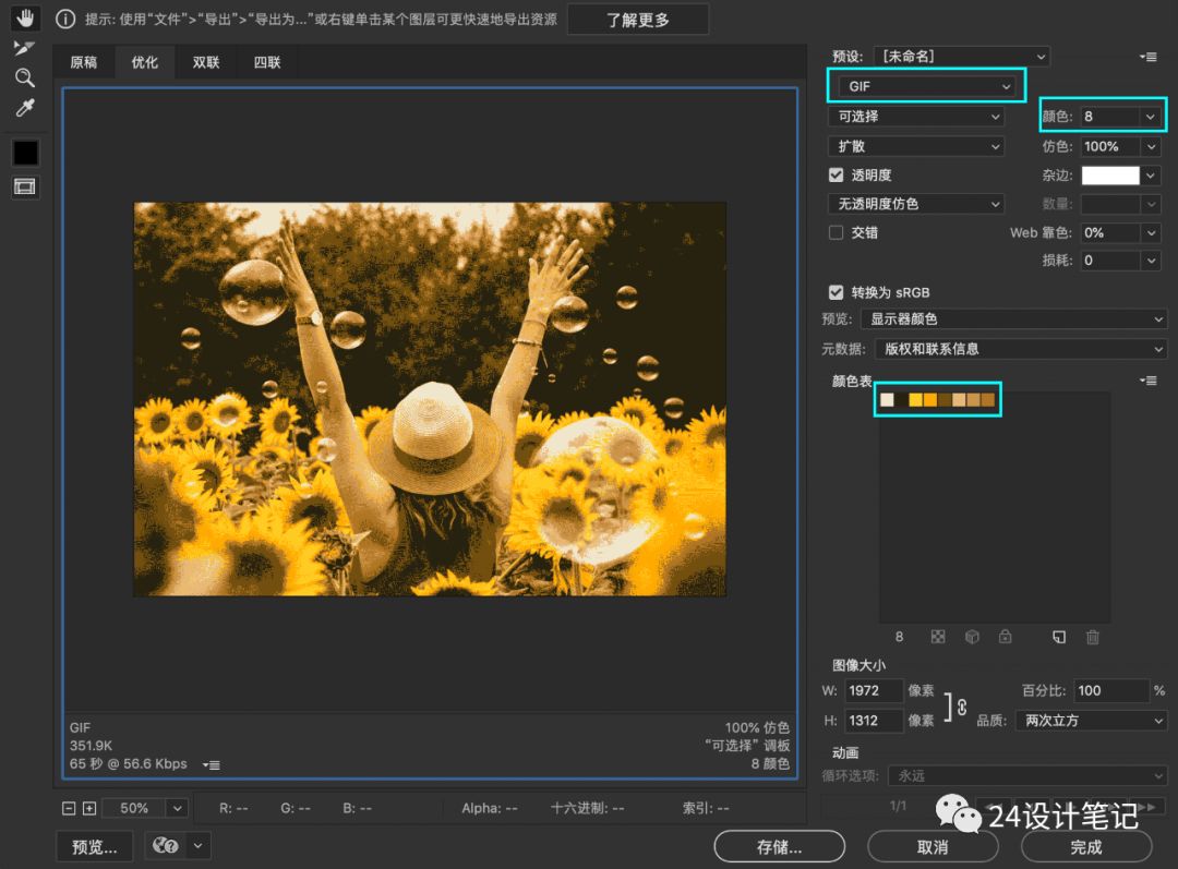 将图片放置到PS中,摁下快捷键Ctrl+shift+alt+S(MAC是shift+commed+option),出现如下界面,格式设置为GIF,颜色设置为8(其它数值也可以),提取后得到框中颜色就是蕴含这种情绪的颜色。